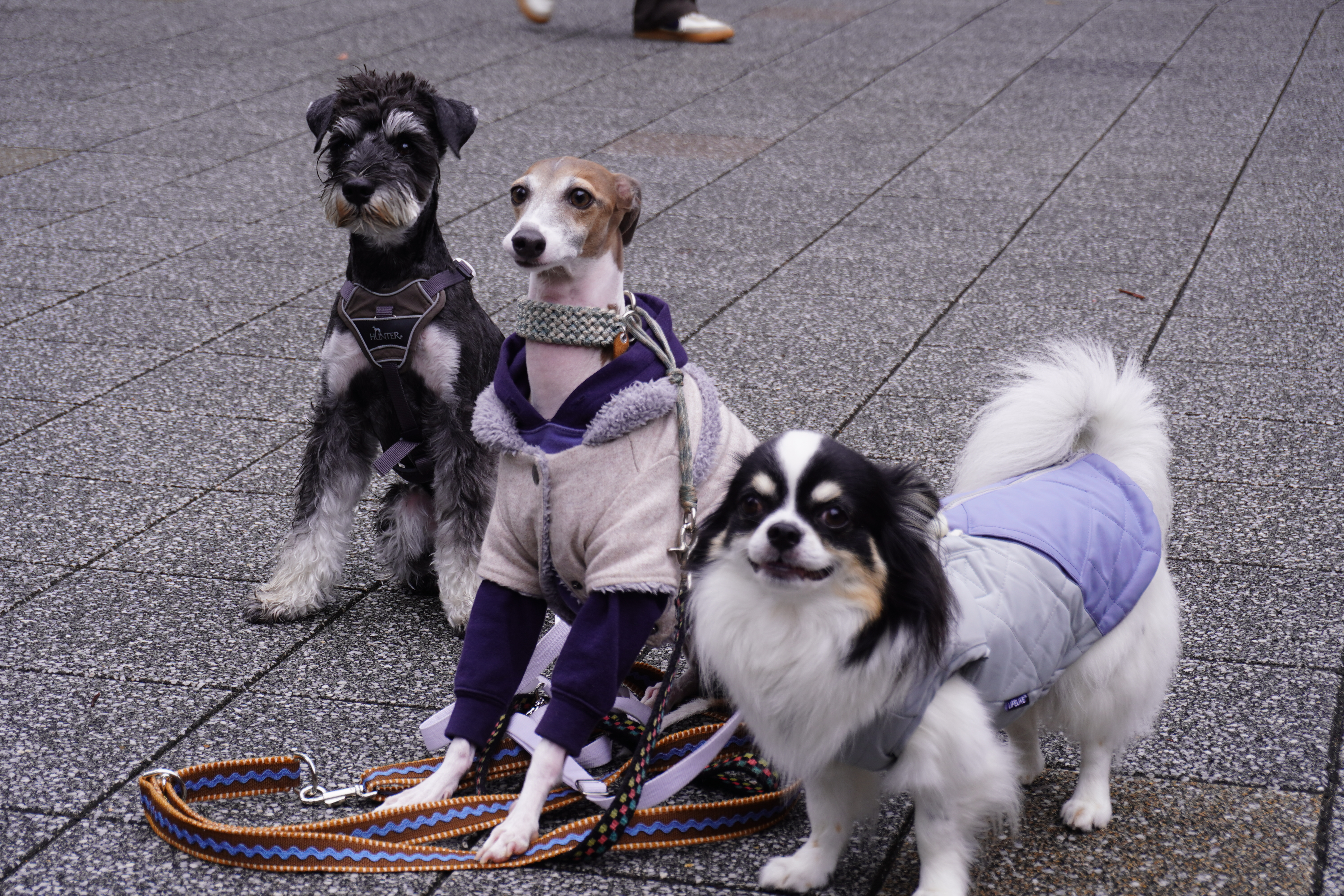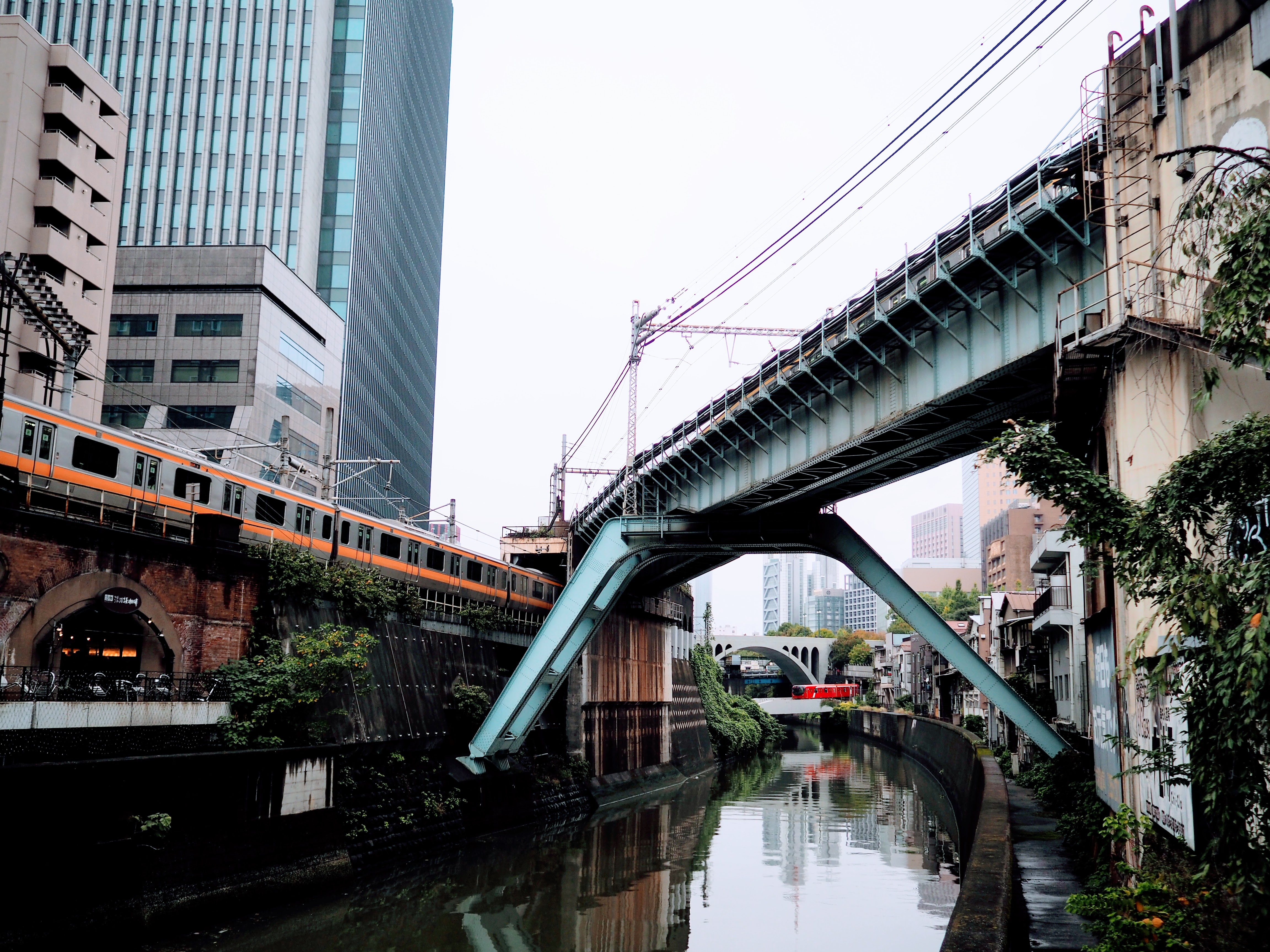 午後からの撮影実習では、懸念されていた雨も上がり、安全・安心に注意を払い行われました。先ずは、御茶ノ水駅近くの神田川に架かる昌平橋周辺で、JR鉄橋の構造物や下流側では川に遊ぶ鳥たちの情景、上流側では正面に東京メトロの丸ノ内線の赤い車体が顔を見せる瞬間と、左右の上部を走るJRの車両を狙いました。その後、パブリックアートのある広場に行きました。幸運にも三匹の犬の散歩に出会い、飼い主に頼み撮らせていただきました。